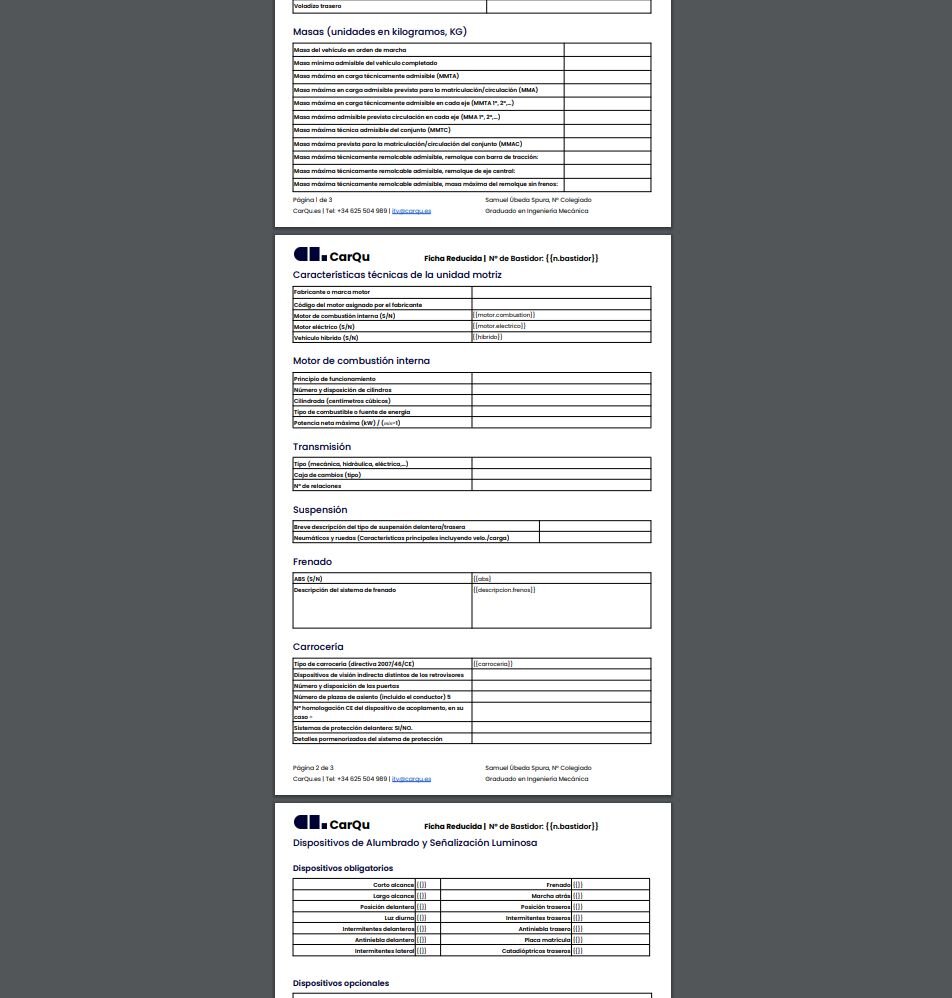 La ficha técnica reducida es un documento oficial redactado por un ingeniero colegiado, que recoge todas las especificaciones técnicas de un vehículo: marca, modelo, motor, emisiones, dimensiones, pesos, neumáticos, etc. Es obligatoria para poder matricular en España vehículos importados o sin documentación española válida, especialmente cuando no se dispone del Certificado de Conformidad (COC) del fabricante. Este documento está regulado por la normativa de homologación nacional (Real Decreto 750/2010) y es reconocido por la DGT y todas las estaciones ITV del país. Su función es certificar que el vehículo cumple con las condiciones técnicas necesarias para circular legalmente en territorio español, y es uno de los documentos clave exigidos durante el proceso de inspección técnica previa a la matriculación.
